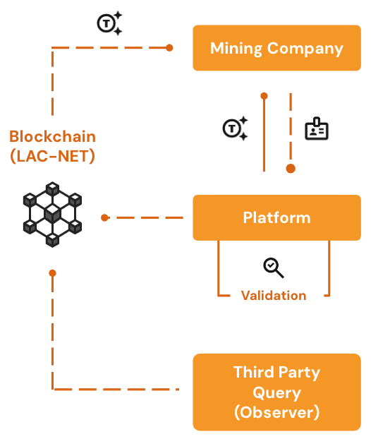 To this end, addresses will be generated on a permissioned blockchain network, which will uniquely represent user profiles participating in the digital ecosystem of the platform. To this end, BID-LAB blockchain network is deployed (LACNet). This tool allows a mining industry to demonstrate compliance with an attribute on the mineral extracted, the process for obtaining it, or its establishment. If compliance is met, a tokenized certificate is issued. Allowed counterparties (a Watcher Agent) may access certificate associated information: